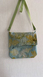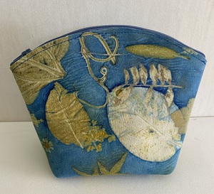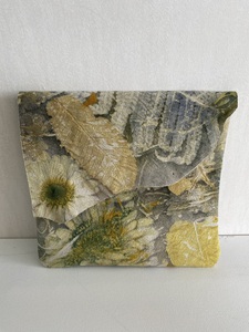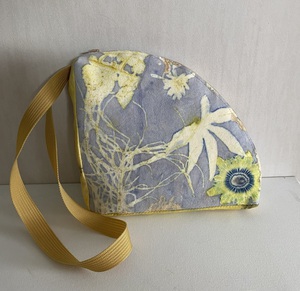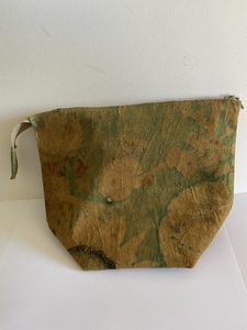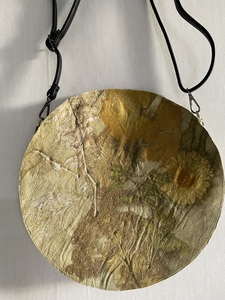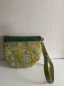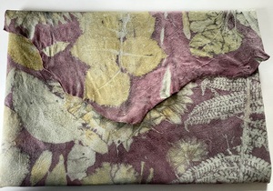 2024Dit is een ecoprint op schapenleer. Ik heb er o.a. zeewier op geprint en passiebloem en -blad. Het tasje sluit met een rits.