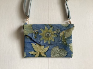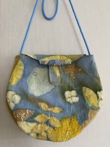 2024Geprint op geitenleer. Beetje turquoise kleur tasje geworden met druivenblad, blad van blauwe regen, bloemetjes enz. Het tasje heeft een polsband en sluit met een rits.
