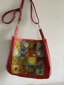 2023Op deze tas een samenstelling van diverse stukjes geitenleer die met bladeren/bloemen geprint zijn. De stukjes zijn genaaid op geitenleer. De tas is gevoerd met een rode verfdeken waarop ook bladafdrukken te zien zijn. De tas sluit met een magneet.