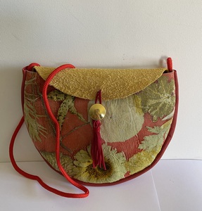 2025Diverse bloemen en bladeren geprint op geitenleer. Het tasje sluit met een rits aan de zijkant. Het handvat is een ring uit Japan. Het is een handig tasje omdat je je hele hand door de ring kunt steken, dus in feite beide handen vrij hebt.