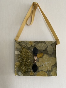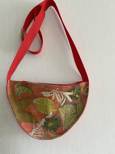2025Met dit tasje heb je je handen vrij (voor een glas). Het is heel zacht geitenleer waarop ik bloemen en bladeren heb geprint. Het tasje sluit met een rits aan de zijkant. De ring komt uit Japan.