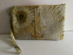 2024Onder andere een zonnebloem en print van een varen is op dit tasje te zien dat geprint is op geitenleer. Het tasje sluit met een rits en is gevoerd met een katoenen ecoprint. Het tasje heeft een polsbandje. Het is een stevig tasje, uniek in zijn soort.